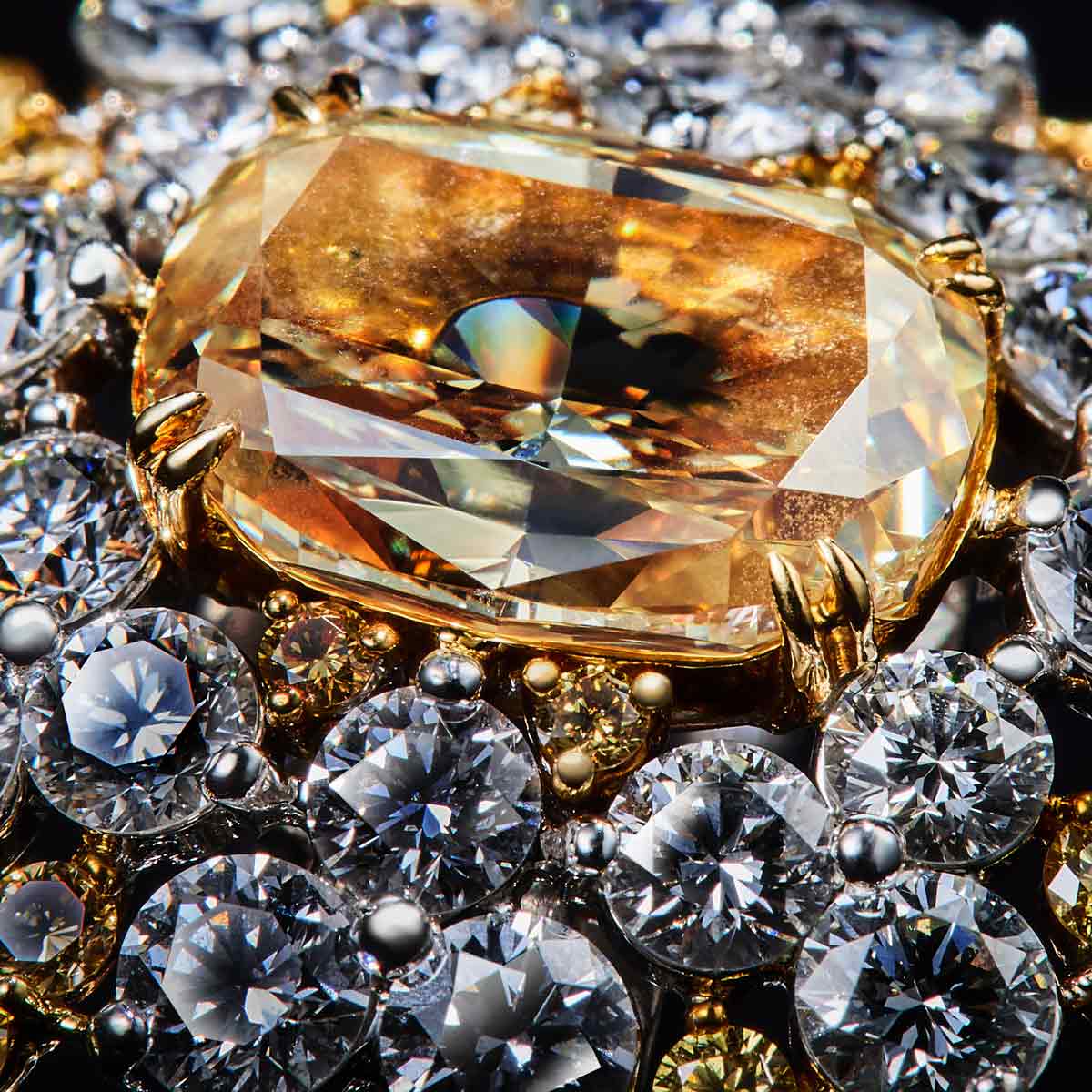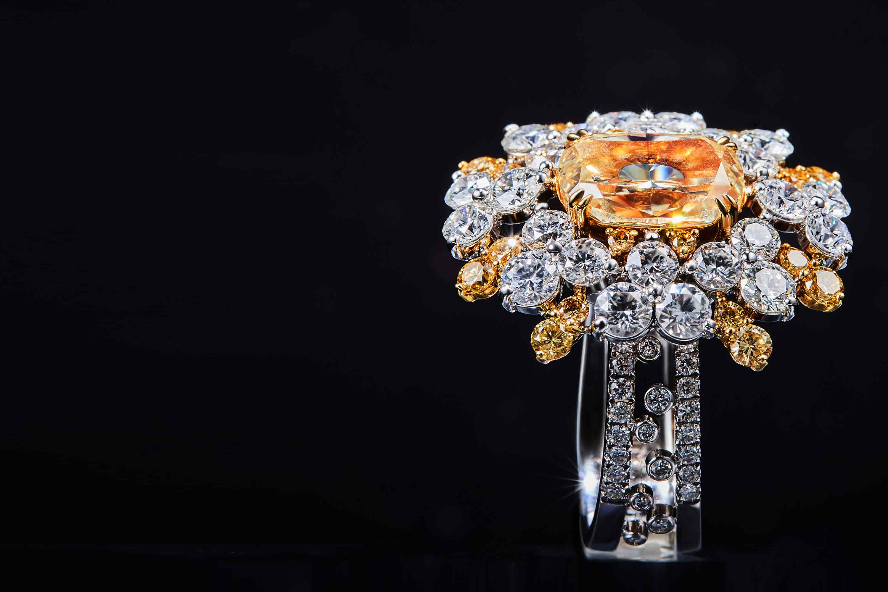 3.73克拉黄彩鑽,象微黎明破曉時的重生與希望,由78顆圓鑽與20顆黄鑽層層環繞,曙光灑落,映照出細膩而著華的光芒。