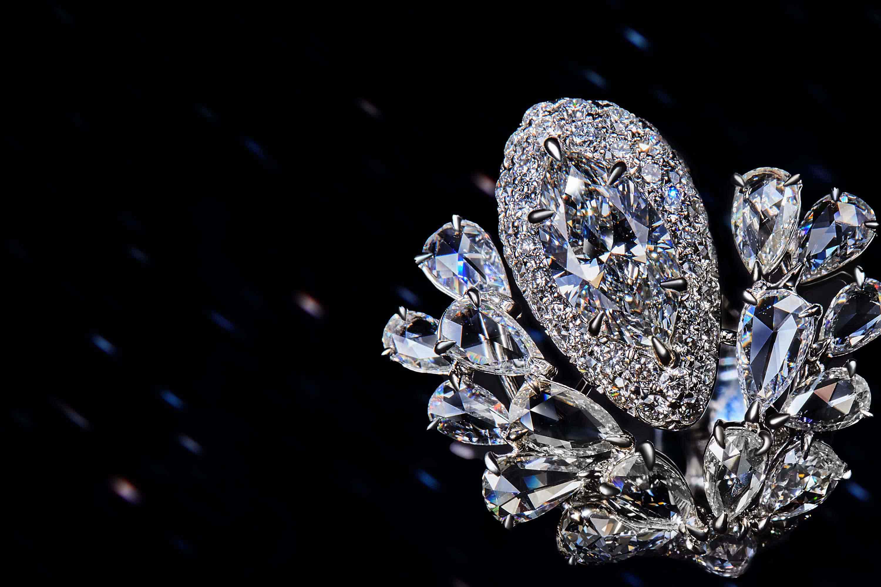 1.01克拉馬眼鑽如輕舟掠影,16個玫瑰車工梨形鑽石簇擁如綻放花瓣,盈盈生輝。